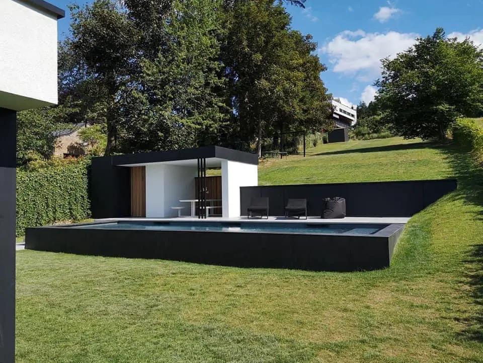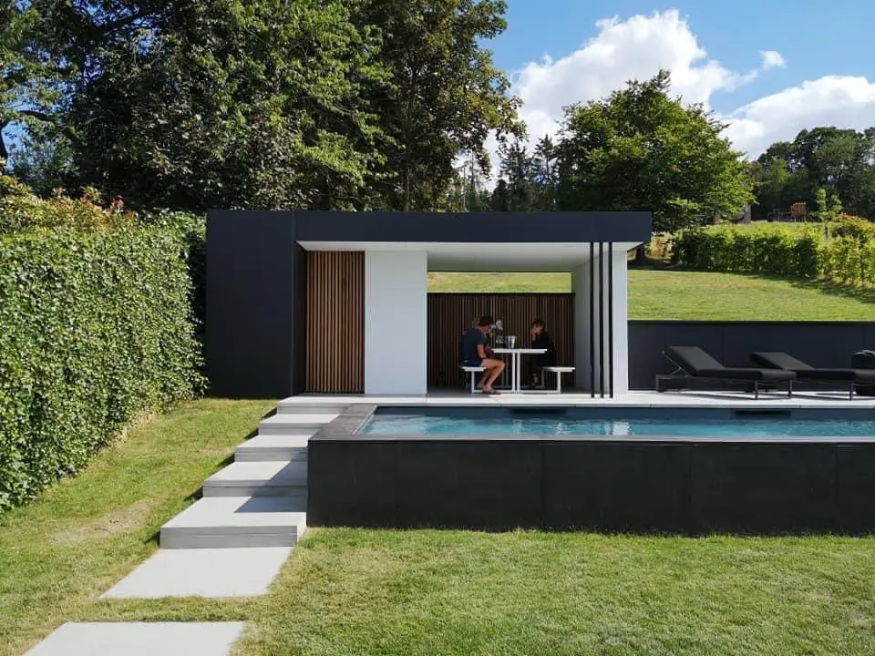 À Wierde, Ligne d’Ô a réalisé cette piscine ultra-contemporaine qui joue sur les contrastes. L’utilisation de blocs à bancher pour une structure robuste a permis de créer un bassin qui semble sortir de terre pour rejoindre un pool house au style architectural fort. Avec ses finitions sombres et son intégration millimétrée dans le dénivelé du jardin, cette réalisation est un modèle d’esthétisme moderne en région namuroise.